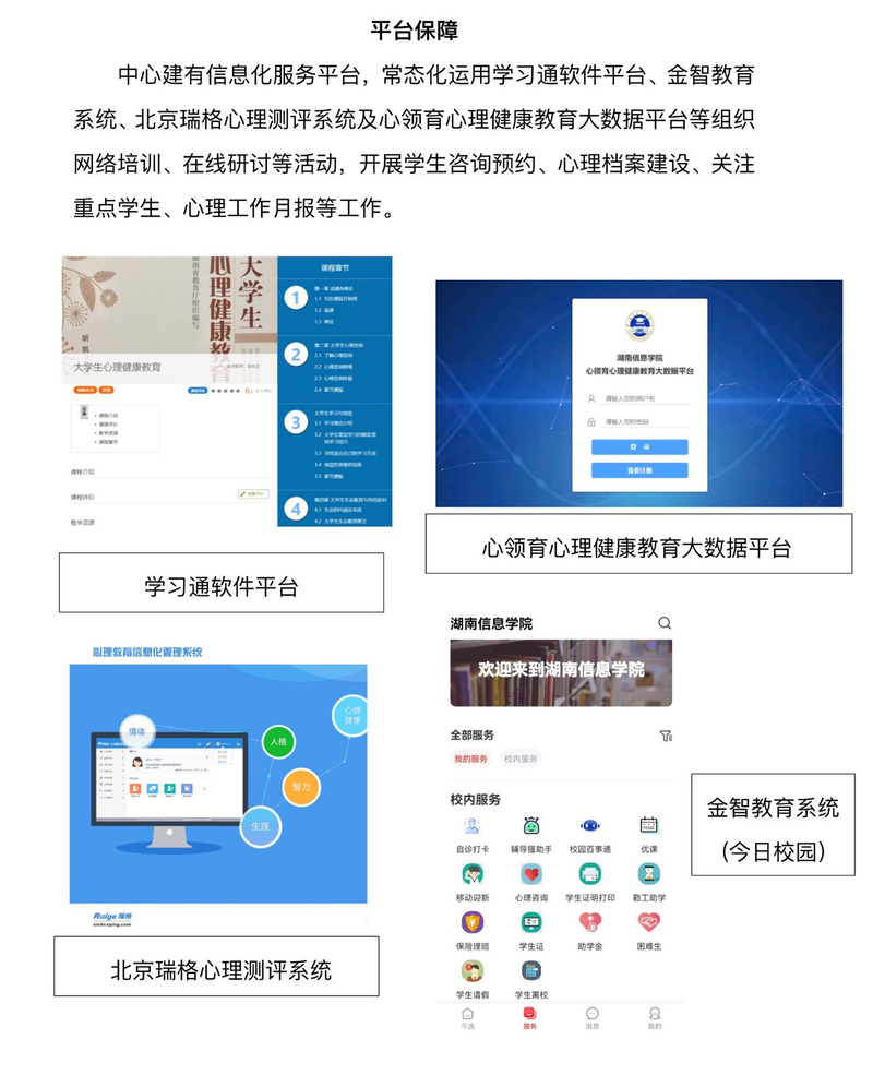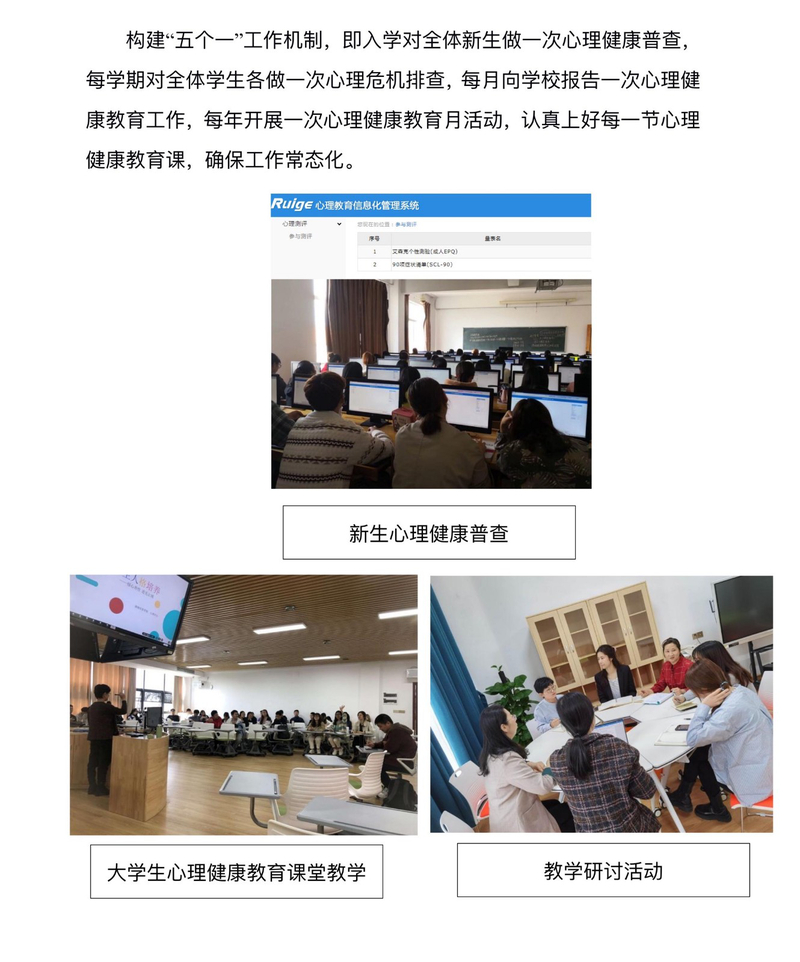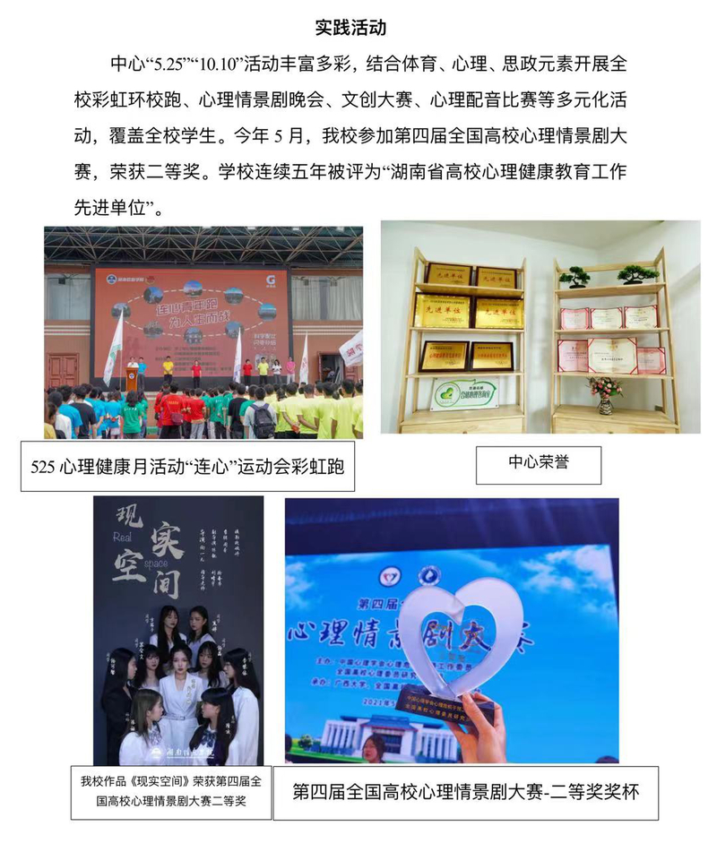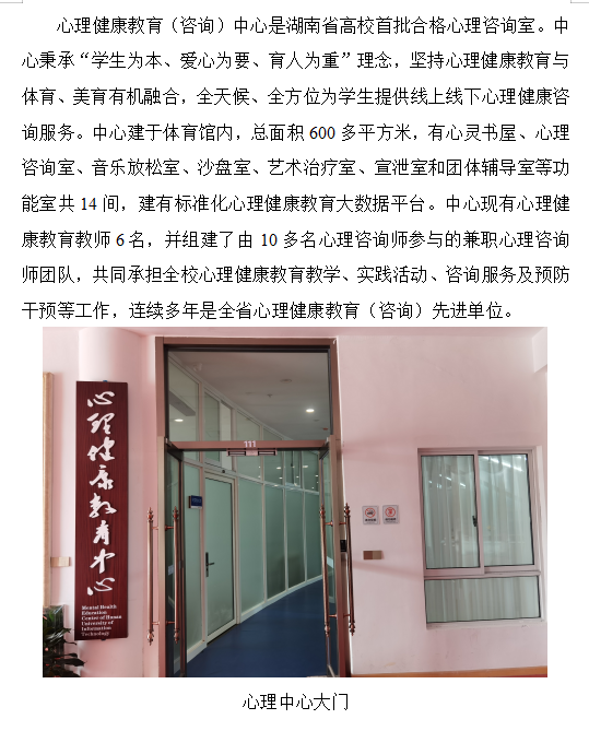 我校心理健康教育中心设在体育馆一楼,融“育身”“育心”教育理念,是湖南省高校心理健康的首创之举。中心占地600㎡,共有14间特色心理健康功能室。中心连续五年被评为“湖南省高校心理健康教育工作先进单位”。部分功能室展示如下: